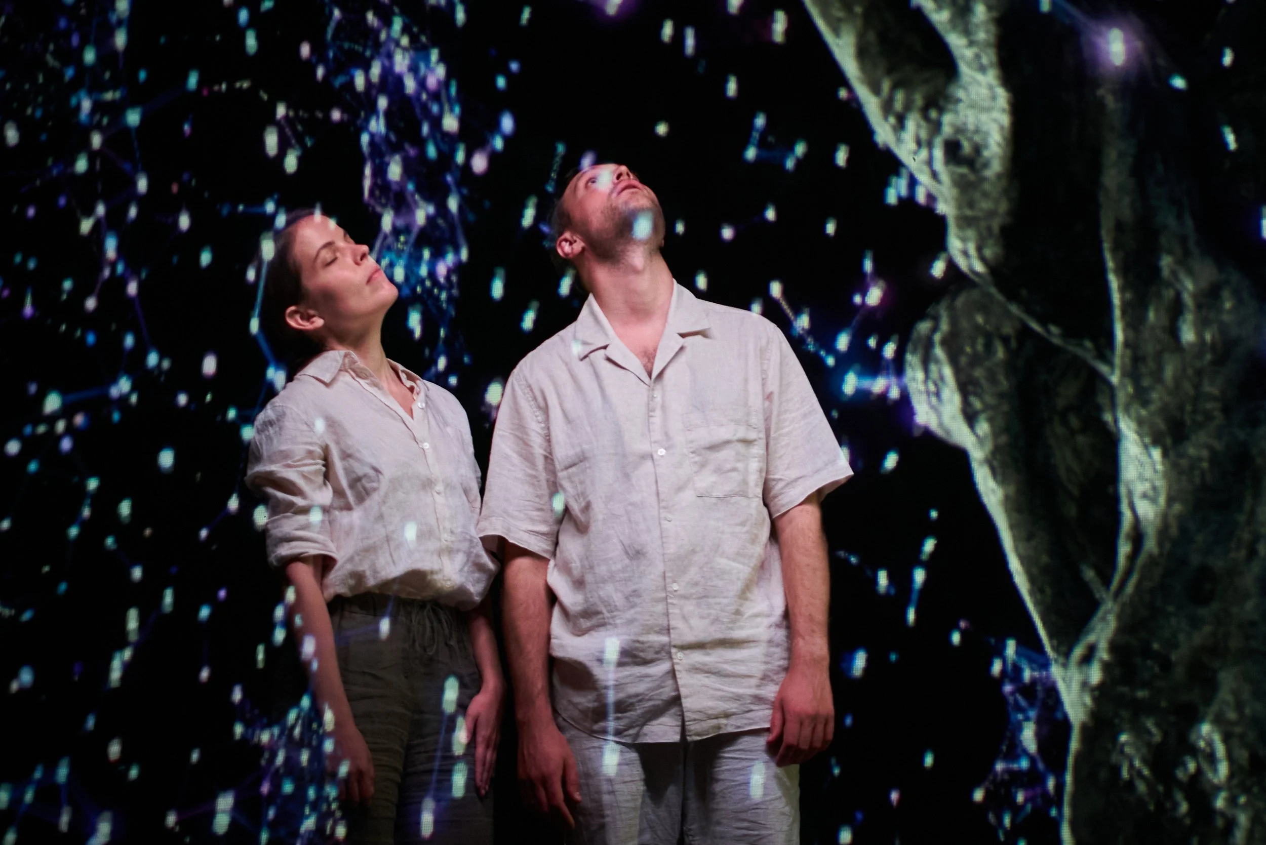 The audience is not merely passive spectators, but becomes an active part of the work, which is generated in real time by an AI that improvises dialogue and creates visual universes. The performance’s hybrid, digital, and physical elements challenge the boundary between the natural and the artificial, inviting us to reflect on how technology can contribute to healing nature. But it is also a love story about the world’s first couple, who, with humor, attempt to return to the primal image of Paradise and bring focus to our ability to understand one another. Is it even possible for us to both be human in the world and at the same time be part of nature?